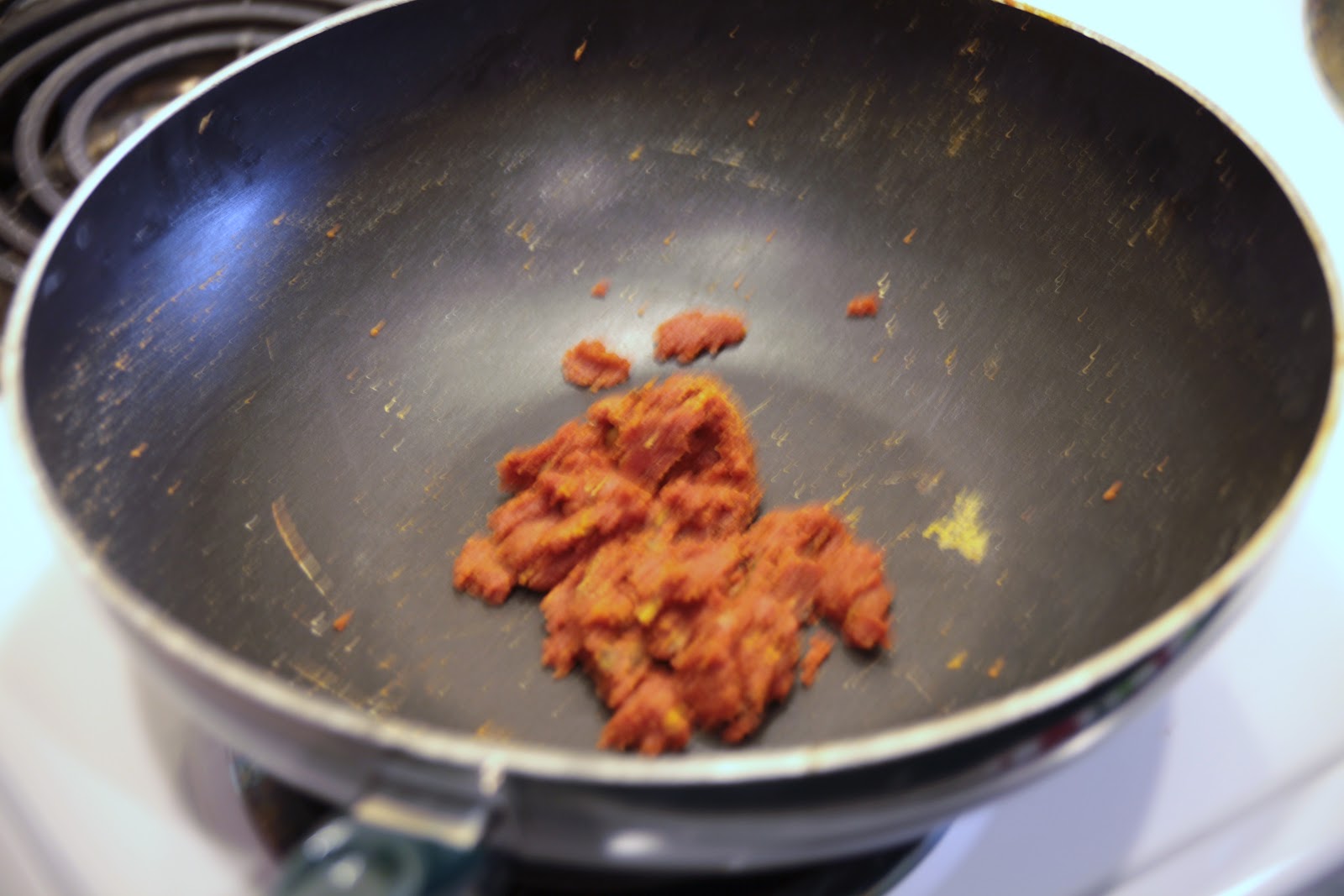 Whisk in 2 Tbsp tomato paste.  This will create a "blob" like below.